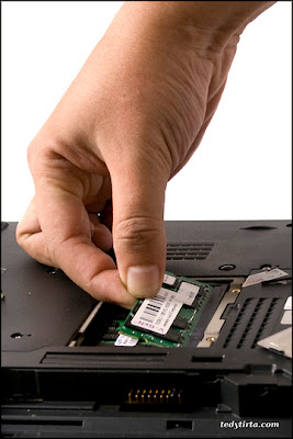 . Jangan nekat memasang notebook dengan charger terhubung ke listrik PLN. Langkah ini sebagai antisipasi terjadi konslet (short circuit). Di salah satu video cara memasang memori yang saya lihat di YouTube, bahkan disarankan untuk menekan tombol power setelah batere dilepaskan. Mungkin tujuannya untuk menghilangkan daya listrik yang masih ada dalam elemen-elemen kapasitif notebook. Juga disarankan untuk membuat tubuh Anda bebas listrik statis, misalnya dengan cara memegang gagang pintu yang terbuat dari logam.